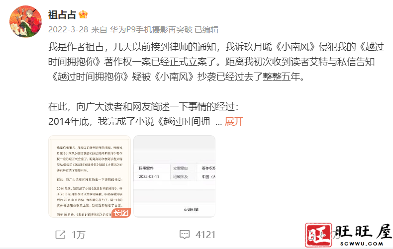 2014年底,我完成了小说《越过时间拥抱你》,并于2015初开始在晋江文学网连载。小说连载完结后的2015年6月份,我和网站签约了,同一时间实体书编辑也联系上我,我们当即敲定了出版。 2016年2月份,我的微博“祖占占”陆续收到了艾特与私信,陌生网友告知,玖月晞于2016年2月在晋江文学网开始连载的《小南风》与我作品《越过时间拥抱你》存在一些雷同。 简单翻阅过《小南风》的连载部分,我陆续发现了一个接一个的“巧合”,心情与状态一落千丈。 至3月份,各平台参与讨论此事的网友渐多,事情开始发酵,在晋江论坛里出现了一个帖子“【挂墙头】融梗天后玖月晞各作品融梗证据(调色盘)”,帖子里记录着晋江论坛网友的讨论,我仔细翻看了网友对两篇文相似之处的列举、观感,以及跟帖中陆续有人指出的细节等,帖里除了玖月晞《小南风》与我作品《越过时间拥抱你》的相似对比,还有她往年一些作品,与其他作者作品的相似情节对比。 3月24日,帖子被转发至微博,引起了一定范围的转发与讨论。 3月27日至29日,有热心读者将《小南风》与《越过时间拥抱你》的相似情节整理完毕,并投诉至当时晋江的“抄袭检举中心”(现已改名“原创违规中心”)。 3月29日,晋江修改了网站的抄袭处理制度,并在晋江论坛发布。对站方突然修改规则的时间,修改后的内容,网友们再次发出争议与质疑,这在晋江论坛与微博平台留下了至今可见的痕迹。 至4月18日,晋江方对3月29日投诉的《小南风》与《越过》调色盘做出判定,处理结果为 “作品《小南风》不构成借鉴过度或者抄袭,驳回投诉”。 目睹这判定结果,我试着联系站方询问该如何维权,对方作品是否已进行签约售出,站方说不方便透露,如果我个人有意向维权,站方会依程序配合取证。 孤立无援下,我试着搜寻可供参考的诉讼案例,并尝试亲自做调色盘。在2016年,能搜寻到的同类型案例不多,也可能是搜寻方式不对,当时我找不到专业比对材料可参考,同时也对“思想表达二分法”充满了不确定的疑惑。虽然基于作者对自己作品的敏感度,我能发现更多分布散乱的情节,但最终做完的调色盘,也不过比热心读者所做的投诉调色盘多出三四处细节。 如果说整理对比材料的困难使我对维权感到疑虑,那么个人的创作收入,却令我对维权望而却步。 《越过》于2015年初在晋江网连载,至5月份连载完毕,一直是免费阅读状态。直到8月份加入晋江VIP,至今(2022年)所得的电子收益不过五千多元。即便有实体书的版税,它的全部收入加起来也不足以聘请专业人士、进行一次著作权维权。 当时分处两地的家人感受到了我的精力不济、状态糟糕,再僵持下去只会更糟。出于对我的爱护,他们纷纷劝阻我着手此事后续。我想起家人曾为网站突然修改抄袭规则而叹息:如果班里有一个学习成绩好的,一个成绩不好的,关键时刻你保哪个呢? 我已于2015年与晋江签约,合同规定每年要有一定字数的作品完成。但我开始为之担虑,这种孤立无援的状态将来是否会再次降临。在我当年的手写日记里,记录着那份始终萦绕不去的、对网站方抄袭规则更改的疑问,与那份保护不了自己作品的屈辱感,是如何慢慢将我击垮,从此变得封闭而消积。 2017年初,我不再登录微博账户,也不再发文到晋江网站。就此远离了与网文有关的事宜,同时也没有了创作收入。 2019年,已忘记是哪段时间,留在我心中十分重要的两笔:一、有热心读者将玖月晞与东野圭吾的作品做出相似情节比对,并翻成日语发送至东野方,此事引起了各社交平台不小的关注;二、有陌生网友发出疑问:如果真的存在抄袭为什么没见过有人起诉? 目睹这两点,我的心中不无感伤遗憾。2016年的事留存了一些糟糕的情绪问题,我总认为过去的事不堪回首,十分屈辱,而自己在维权路上是一个逃兵。 事情第一个转折,发生在2020年的最后一天。我关注到庄羽老师有意向成立反剽窃基金,很快地,反剽窃基金于2021年初成立。 最初我的设想是请专业人士帮忙鉴定,当年《小南风》与《越过时间拥抱你》的调色盘是否具备维权的可能性,却也犹豫如今事隔多年,究竟该从何说起,而过往已平复的伤痛,是否会因此而复发。犹豫之下,这一拖又是几个月。如若不是后来年中时出现的事件,此事有可能已经搁下,不了了之。 2021年7月10日,微博出现“玖月晞告读者”事件。通过当事人纵爱置顶的长微博,我了解到她的个人遭遇,心中不能平静,纵使我是一个逃兵,也再无可能坐得住。 与此同时,反剽窃基金对事件的转发彻底坚定了我的信心,我立即决定登录微博尝试联系反剽窃基金。