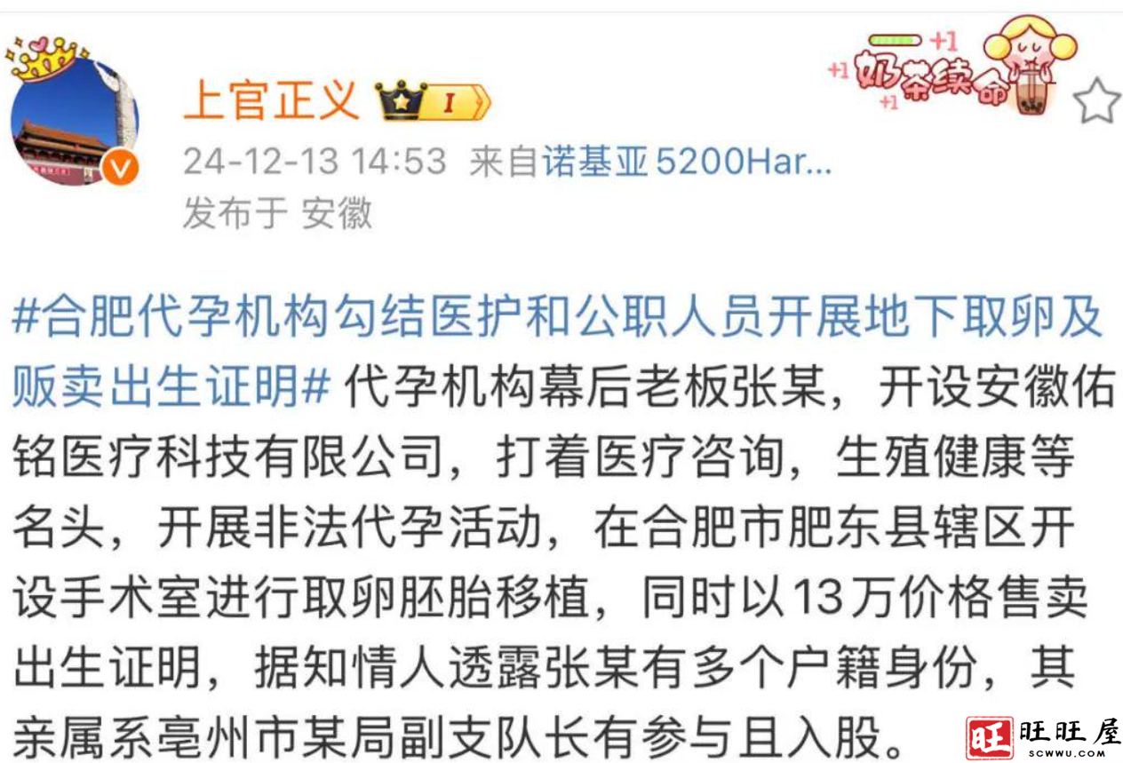 首页新闻 正文 据合肥发布12月15日消息:12月13日,接到网民举报佑铭医疗科技有限公司在合肥、亳州存在开展非法代孕等问题,合肥、亳州市高度重视,已成立公安、卫健、纪检监察、市场监管等部门组成的联合调查组依法依规严肃查办。目前,已对涉案5名犯罪嫌疑人依法采取刑事强制措施,案件正在进一步办理中。针对反映公职人员违纪违法线索正在核查,无论涉及到谁,一经查实将依法依纪依规严肃处理、绝不姑息。此前报道:12月13日,打拐志愿者上官正义发布微博称,安徽佑铭医疗科技有限公司打着医疗咨询、生殖健康等名头,开展非法代孕活动,在合肥市肥东县辖区一别墅内开设手术室进行取卵胚胎移植,同时以13万元的价格售卖出生证明。据都市现场报道,该公司老板张某介绍,公司已经实现了生育的全产业链包办服务,其中包括供卵志愿者(俗称“卵妹”)挑选,开设取卵移植的个人手术室、实验室,组织专业医生操刀,以及选定代孕妈妈产检分娩的合作医院,甚至包办出生医学证明等业务。其提供了一套“供卵”+“代孕”的生殖方案,也就是需要一名供卵志愿者以及一位代孕妈妈,并出示了服务内容为“试管婴儿代孕大包托管服务”的《健康服务托管合同》。张某曾自称,卵妹可以按照客户的需求进行学历、颜值、血型、身高定制,但价格不菲;“211卵妹起步就是20万元,985的话可能要30万元起,北大清华的话可能要更高了。像北大清华、中国科技大学的可能要90万元起。”供卵志愿者年龄需要在18岁至25岁,代孕妈妈年龄则是25岁以上或35岁左右,且身体健康有顺产史。另外,他们对于代孕妈妈也有着严格的要求与管理,“我们都有专门做饭的,配备管理代孕妈妈衣食住行的队伍。”12月13日,记者从合肥市卫健委处获悉,目前,卫健委已与当地警方联合介入调查此次涉嫌代孕事件。 版权声明:未经旺旺屋授权转载请注明来源,否则侵权必究