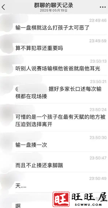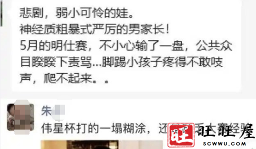 从爆料截图可看到,有人反映称,小朱一旦输棋就会遭到爸爸殴打: