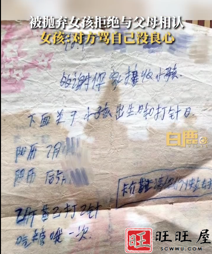 从女孩晒出的多张早年手写凭据来看,亲生父母曾写下“多谢你家接收