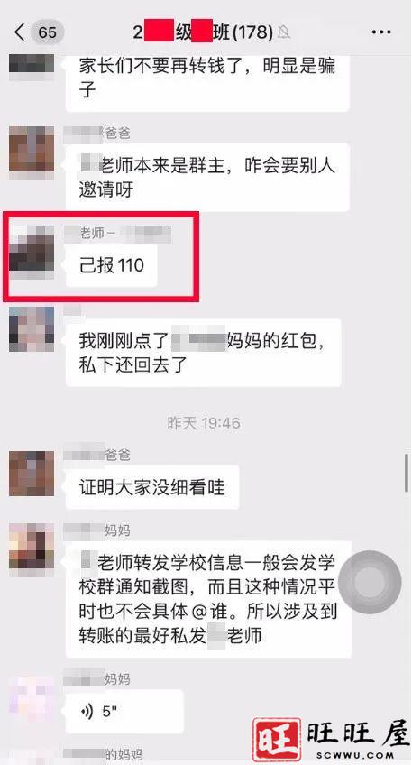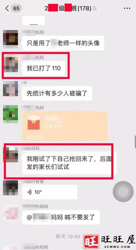 可是,等到其他家长发现这位自称班主任的人并非真正的班主任时,已经晚了,多名学生家长发出去的198元红包,已被骗子领走。 幸运的是,意识到异常的群众及时私聊了真正的班主任,才得以揭穿了该骗局,真正的班主任来了后,立即将骗子踢出了微信群,并提醒家长们不要发红包,以防再次上当受骗。